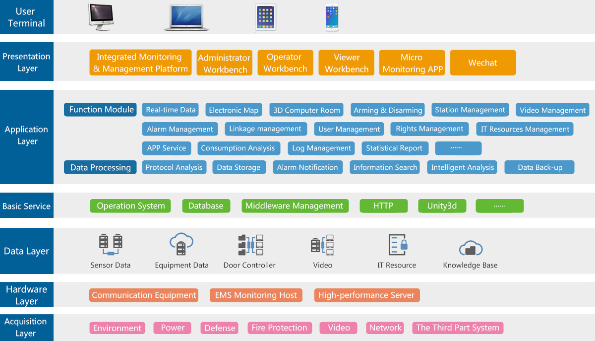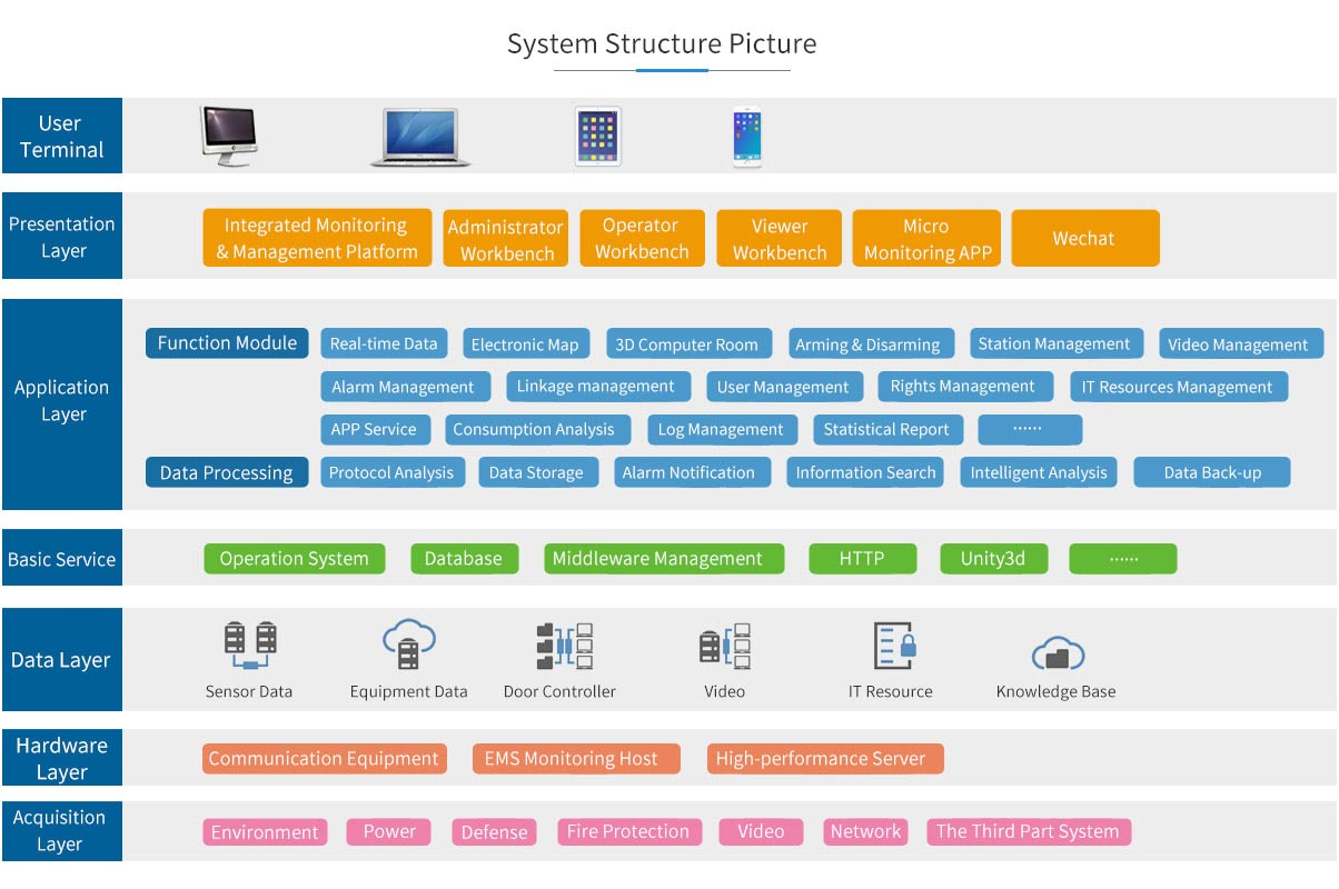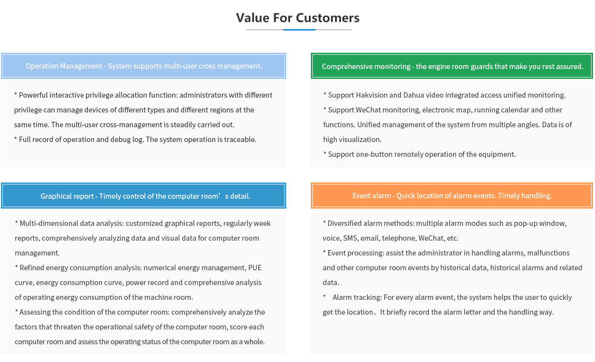 * Refined energy consumption analysis: numerical energy management, PUE curve, energy consumption curve, power record and comprehensive analysis of operating energy consumption of the machine room.