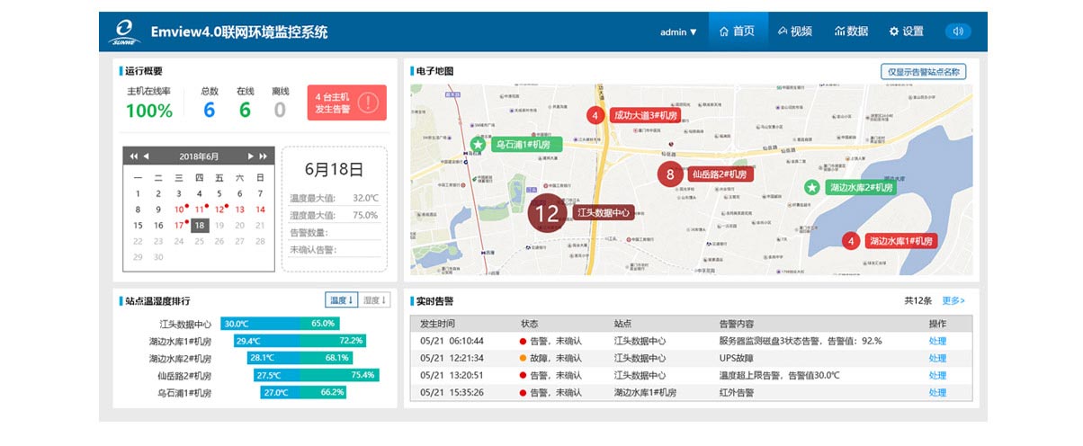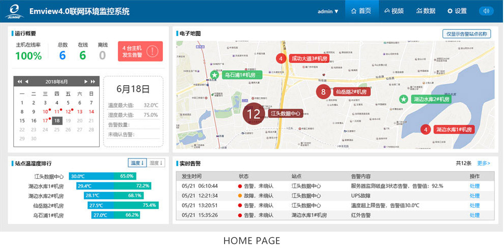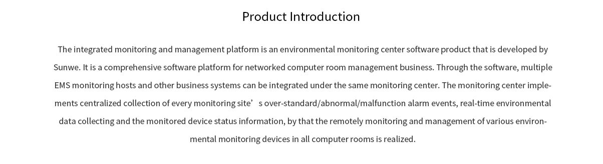 The integrated monitoring and management platform is an environmental monitoring center software product that is developed by Sunwe. It is a comprehensive software platform for networked computer room management business. Through the software, multiple EMS monitoring hosts and other business systems can be integrated under the same monitoring center. The monitoring center implements centralized collection of every monitoring site's over-standard/abnormal/malfunction alarm events, real-time environmental data collecting and the monitored device status information, by that the remotely monitoring and management of various environmental monitoring devices in all computer rooms is realized.