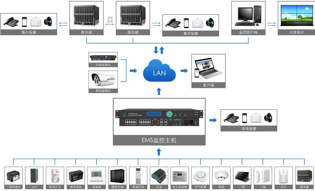 EMS系列監(jiān)控主機主要用以采集數(shù)據(jù)、處理數(shù)據(jù),可對環(huán)境、運行負載、設備溫升、局放工況、安防、視頻、消防、智能設 備等進行一體化監(jiān)控。在實際應用中,與不同類型的傳感器相連,布線簡潔,操作方便。