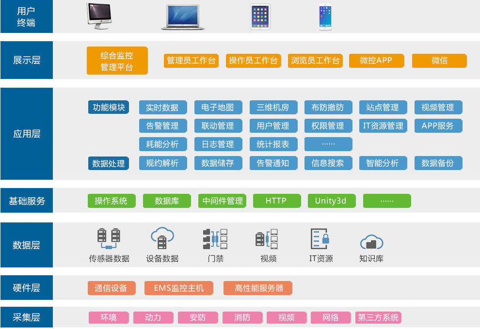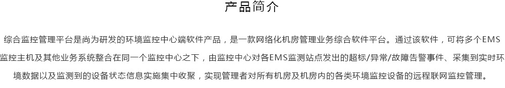 綜合監控管理平臺是尚為研發的環境監控中心端軟件產品,是一款網絡化機房管理業務綜合軟件平臺。通過該軟件,可將多個EMS監控主機及其他業務系統整合在同一個監控中心之下,由監控中心對各EMS監測站點發出的超標/異常/故障告警事件、采集到實時環境數據以及監測到的設備狀態信息實施集中收聚,實現管理者對所有機房及機房內的各類環境監控設備的遠程聯網監控管理。